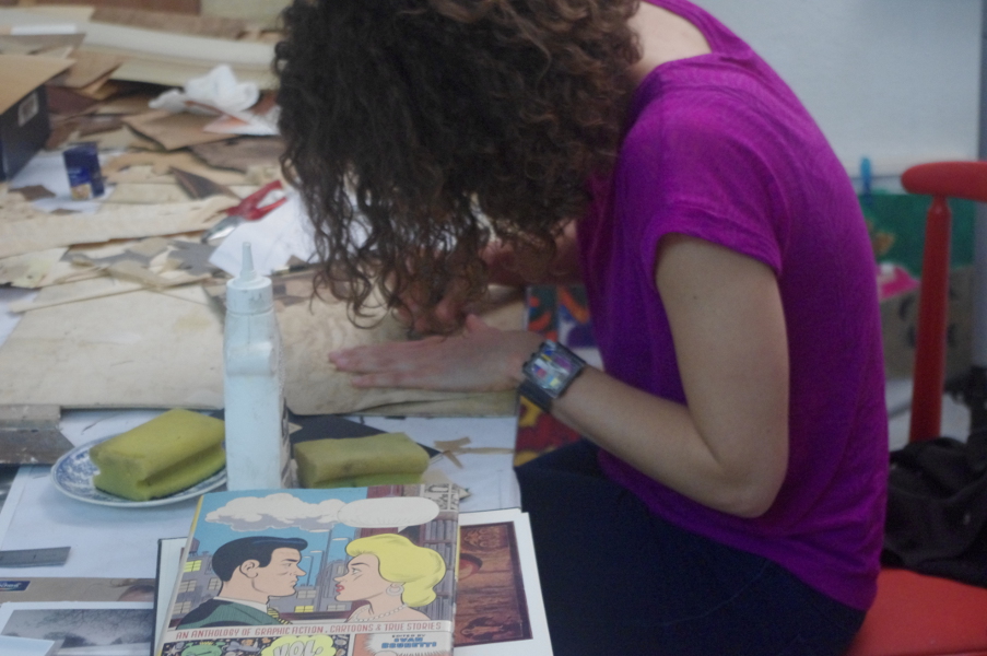 Wenn, wie in der Collage, mit vorgefundenem Material gearbeitet wird, liegt immer eine interessante Mischung an: einerseits ist die Menge der Möglichkeiten limitiert, man findet NIE exakt den Schnipsel, den man braucht. Andererseits bekommt man unendlich viel Anregung aus der Menge an Material, dass, ungefragt, auf dem Tisch herumliegt, und immer mehr wird, je länger man an der Collage arbeitet.