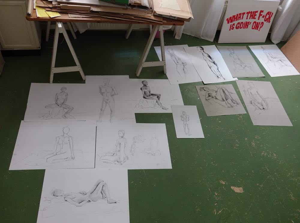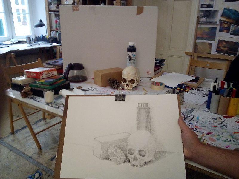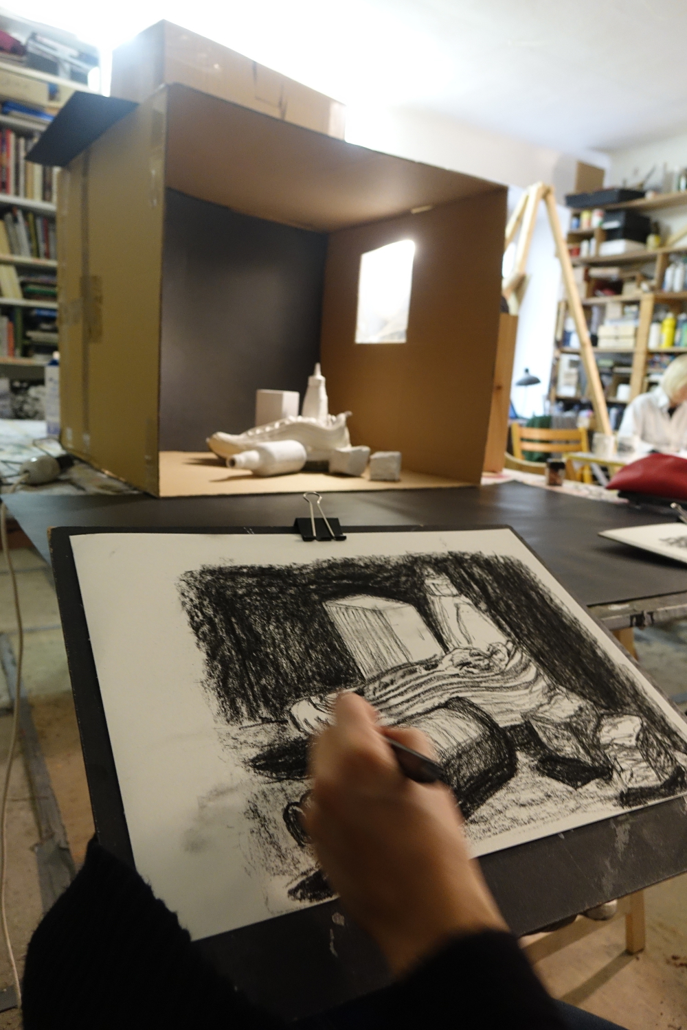 Wir gehen skizieren und zeichnen, mit verschiedenen Zeitrahmen, von schnellen Skizzen zu detailreicheren Arbeiten. Zwischendurch treffen wir uns im Atelier, mit einem Kaffetopf in der Hand, und schauen an, was da entstanden ist und besprechen es. Wie üblich gebe ich dabei ein paar Arbeitsrahmen und Aufgabenstellungen mit rein, die dem ganzen eine Struktur vorschlagen.