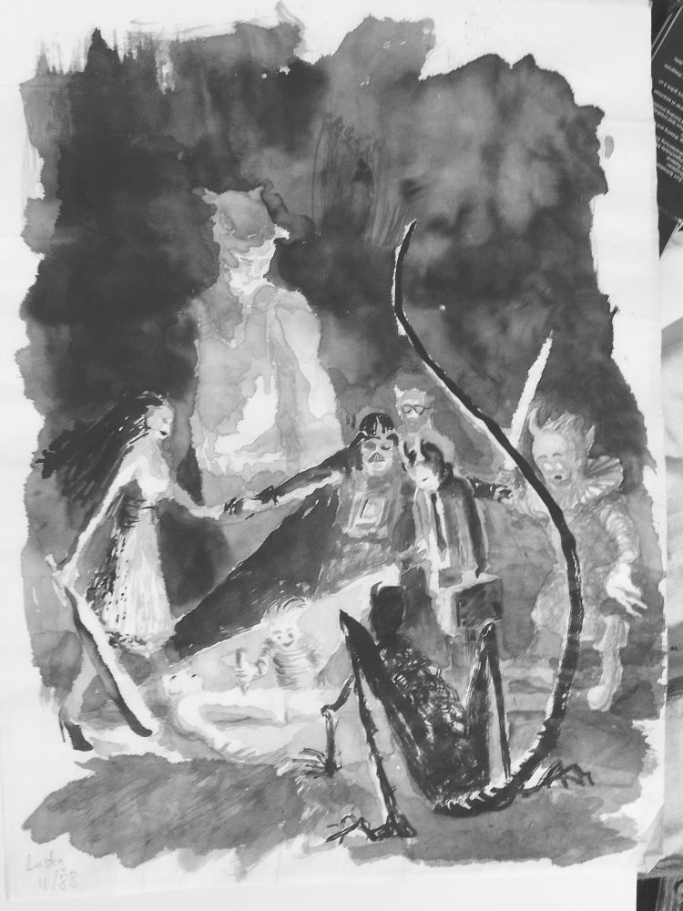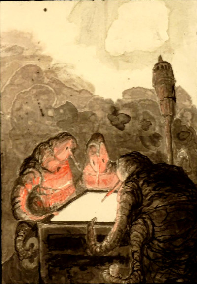 Als Ergebnis des Workshops sollten einige raschere Farbskizzen entstanden sein, und eine oder mehrere entwickelte Bilder, je nach persönlicher Arbeitsgechwindigkeit. Vielleicht eine kleine Serie von zusammenhängenden Bildern aus der gleichen Intention entwickelt? Da wäre der Schrat glücklich! Und ihr wohl auch…