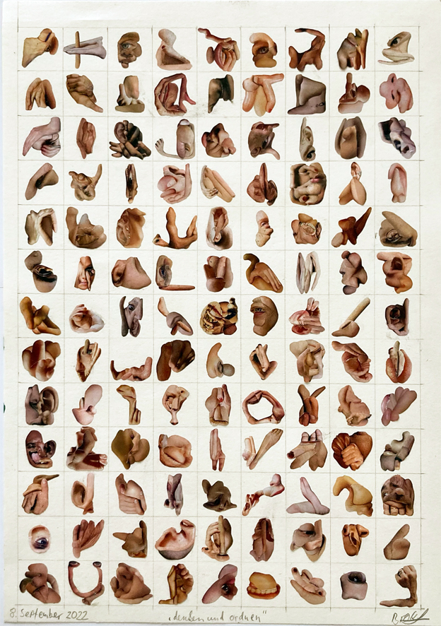 Das bringt auch unsere Ideen auf ganz andere Wege, als es in der freien Zeichnung oder Malerei der Fall wäre, die Entscheidungen über Form, Farbe und Bedeutung fallen anders. Jan Brokof hat sich seit vielen Jahren auf verschiedene Weise ausführlich mit Collage beschäftigt. Seine komplexen, beschrifteten Schränke mit Schubladen, die Schnipsel zu 10000enden enthalten sind Legende…