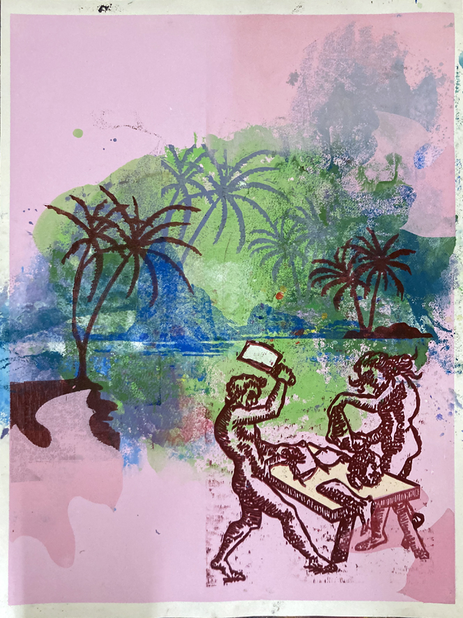Gut wäre, wenn jeder Teilnehmer mit einigen Motivideen ankommt. Es mangelt zwar nicht an Inspiration und Vorlagen im Atelier, aber wenn an der Motivsuche zu viel Zeit verloren geht, ist das immer schade. Mitgebrachte Motive werden gemeinsam besprochen, wie man sie angehen könnte, Strukturen, Richtungen, Flächen, Linien. Spannung und Balance. Am ersten Tag wird das erste größere Motiv begonnen zu schneiden. Da die Arbeitsgeschwindigkeiten von Euch meist sehr verschieden sind, können die ersten Probedrucke bereits an Tag 1 geschehen. Meist wird erst an Tag zwei gedruckt. Wichtig ist häufiges andrucken, schauen, in den Andruck hineinzeichnen, weiterschneiden. Wer schnell ist oder besonders in Schwung kann natürlich ein weiteres Motiv schneiden, oder, vielleicht noch viel spannender: Eine zweite Farbplatte schneiden… zum unterdrucken, zum überdrucken… Jan Brokof arbeitet seit vielen Jahren mit Holzschnitt, Farbholzschnitt oder dem zusammen-drucken von Teilschnitten. Auf der Ebene gibt es viel Erfahrung, die gern geteilt wird.