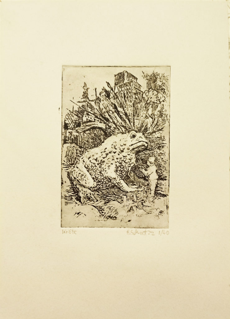 Wer schon mit mir gearbeitet hat weiß: Ich bin kein Technik – Nerd. Wer einen technisch orientierten Workshop machen will, da empfehle ich zu einer Radierwerkstatt zu gehen, die können das besser. Ich fokusiere auf die Grafik, wie entsteht eine dichte, tragende Form, wo braucht es Struktur, wo Linien, und was könnte man für herrlichen Unsinn mit der Säure auf der Platte anstellen… das kann schon auch mal wild sein, vieles ist nicht genau kalkulierbar – die Wärmeveränderung der Säure beim Ätzen beispielsweise, oft entstehen Dinge, die so nicht geplant waren. Von dort dann weiterzugehen, dass ist spannend. Ich bin der Mann für die Grafik, nicht für die Technik.
