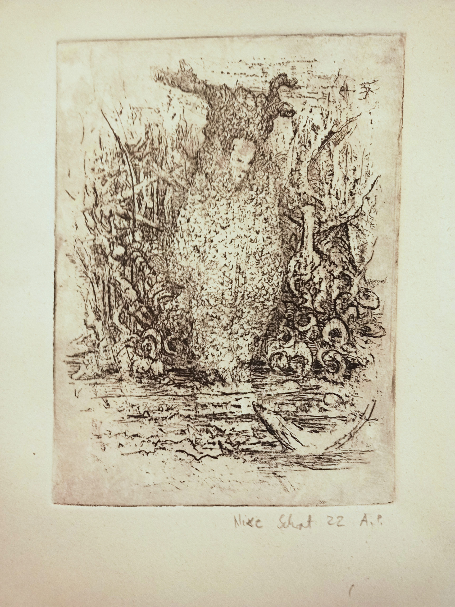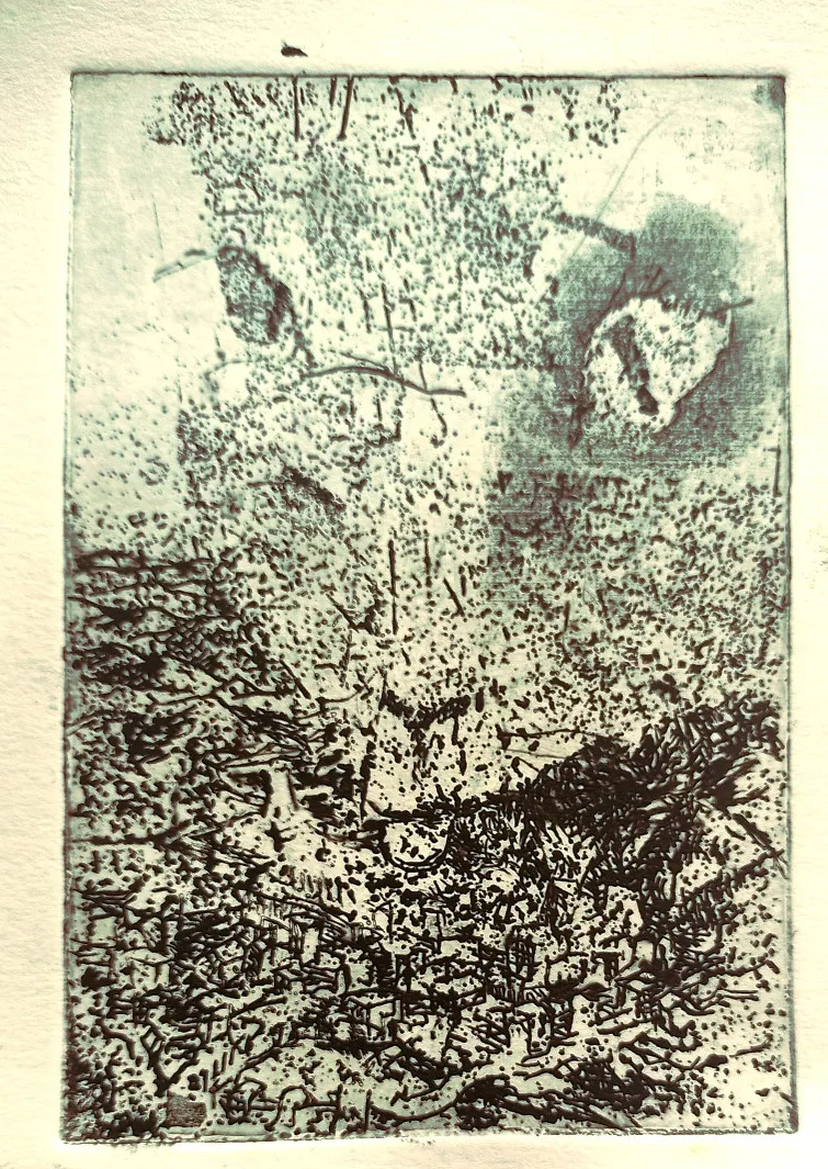 Ich empfehle durchaus 2 -3 Ätzvorgänge, wo Linien vertieft und zusammenhängende Dunkelheiten gesetzt werden. Allerdings ist es ratsam, das meiste im ersten Radiervorgang zu erwischen, weil die Sichtbarkeit im Arbeiten – helle Linien im dunklen Grunde – dort am höchsten ist. Später muss man echt mitdenken…. Das ist an der STelle nicht so einfach wie Kaltnadel.
